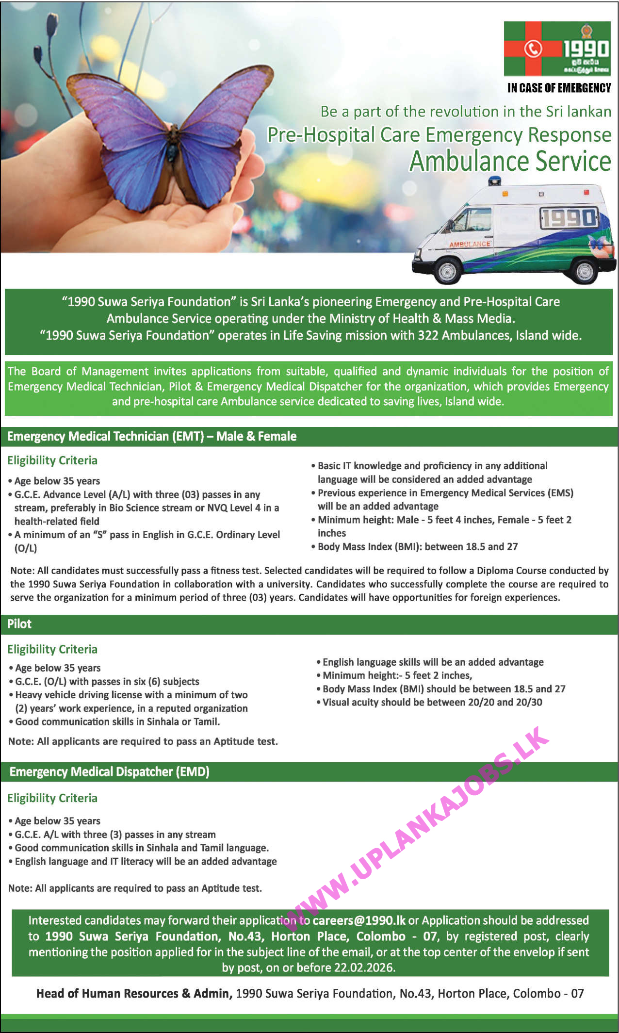 1990 Suvaseriya Ambulance Service Vacancies 2026