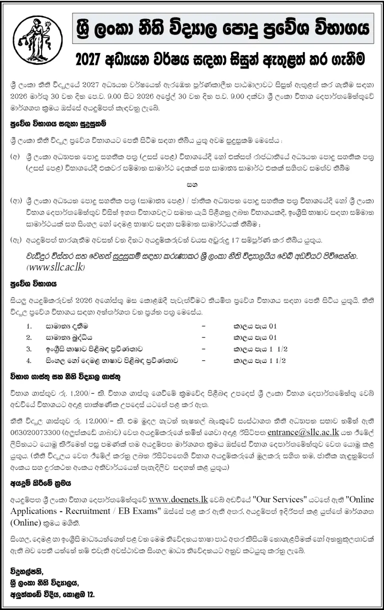 Applications are called for the admission of students to the Sri Lanka Law College for the Academic Year 2027 (full-time course) from 9.00 a.m. on 30 March 2026 to 9.00 p.m. on 30 April 2026 on the Online System of the Sri Lanka Examinations Department.