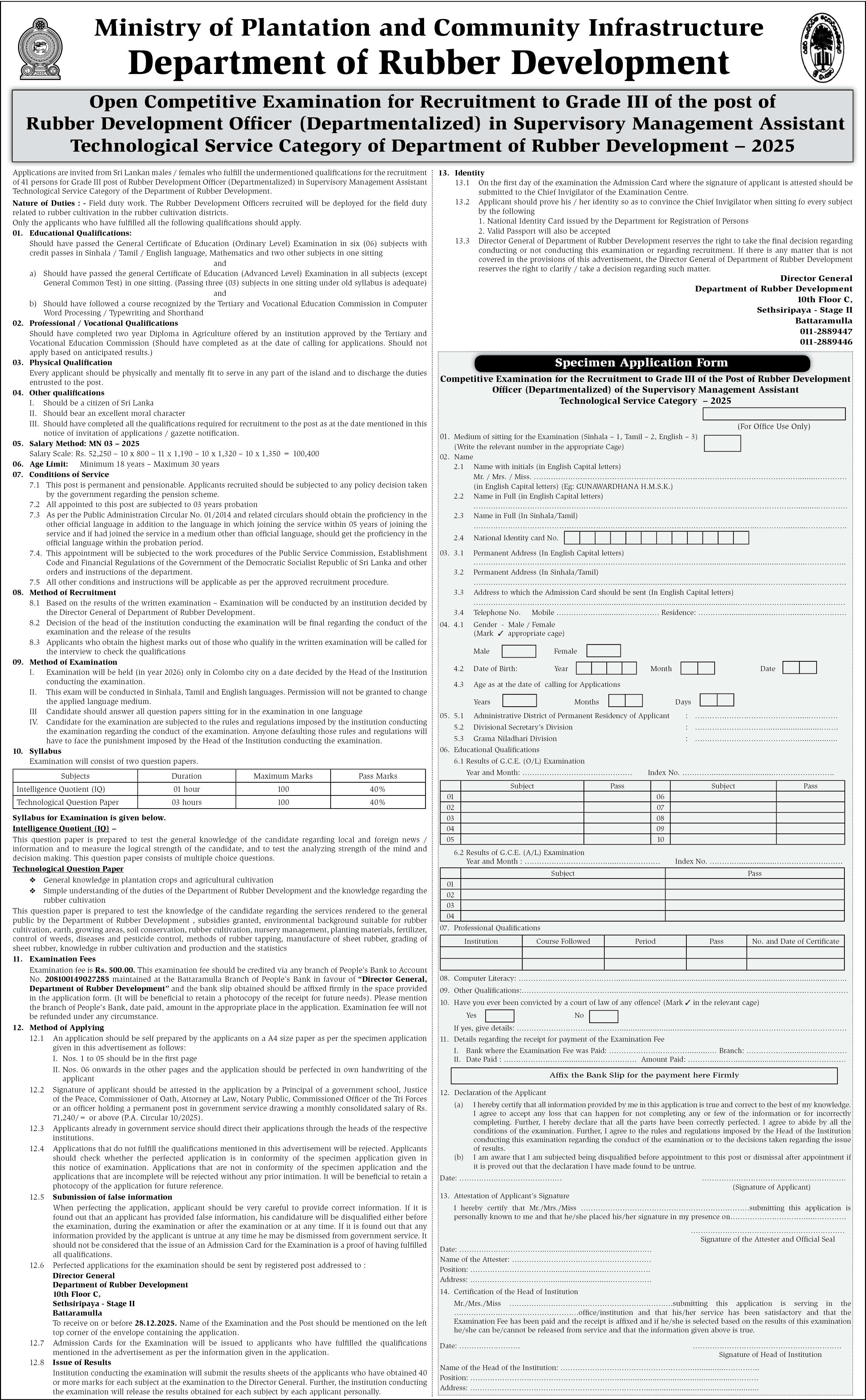 Open Competitive Examination for Recruitment to Grade III of the post of Rubber Development Officer (Departmentalized) in Supervisory Management Assistant Technological Service Category of Department of Rubber Development – 2025