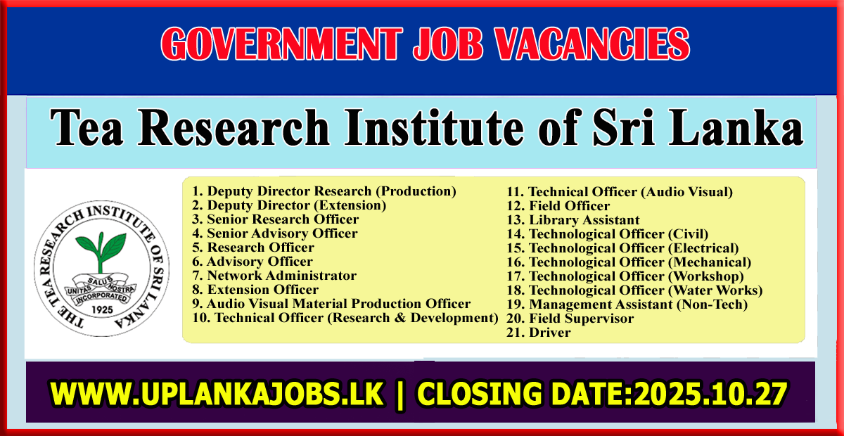 The post applied for should be written on the top left-hand corner of the envelope that contains the application should be sent to the Director / Chief Executive Officer, Tea Research Institute of Sri Lanka, St. Coombs, Talawakelle, on or before 27th October 2025.