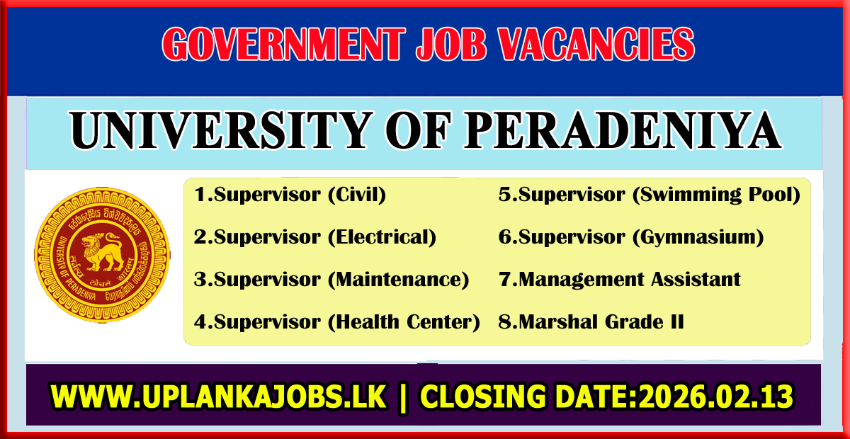 The University of Peradeniya will entertain applications for the following posts from the permanent confirmed employees of the University Grants Commission/ Higher Education Institutions/ Institutes/ Campuses. Every application should be made in the prescribed form (annexed). It should be channeled through the Secretary of the UGC or the Principal Executive Officer of the Higher Educational Institutions/Institutes/Campuses.